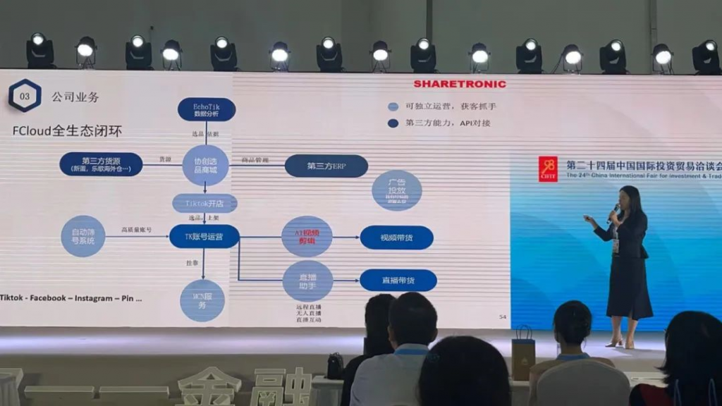 洽谈会现场,协创数据董事会办公室甘杏,还向与会嘉宾分享了协创数据业务经营情况及全球化产业的核心竞争力与成果,提到了FCloud全生态闭环产业布局,依托FCloud云手机SaaS营销系统,链接第三方货源、选品数据分析、商品管理ERP、MCN机构服务等合作,为跨境出海商家全球业务拓展提供全链路解决方案。