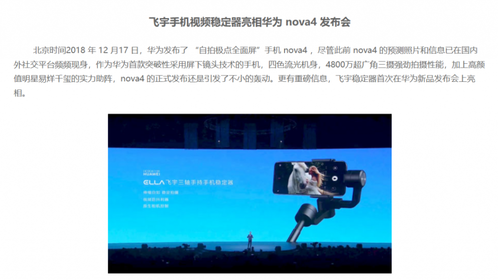 - 2018 年,飞宇与华为联合研发的 ELLA 手机稳定器亮相华为新品发布会,获得全球曝光。