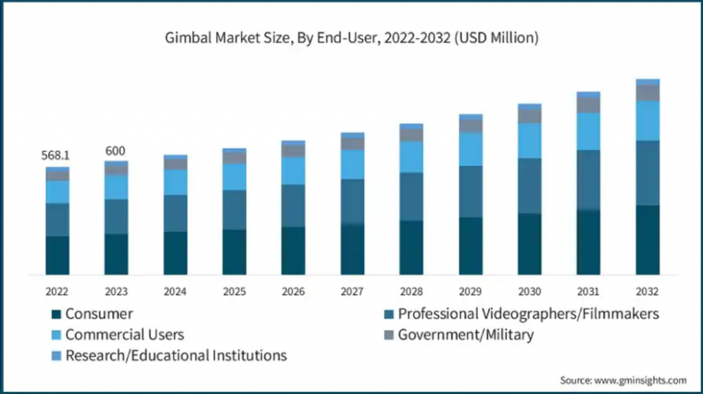 数据显示,2023年,全球手持稳定器市场规模达6亿美元,预计2024年至2032年复合年增长率将超过6%。TikTok、YouTube等平台上的视频内容日益流行,推动了对高质量影像的需求。