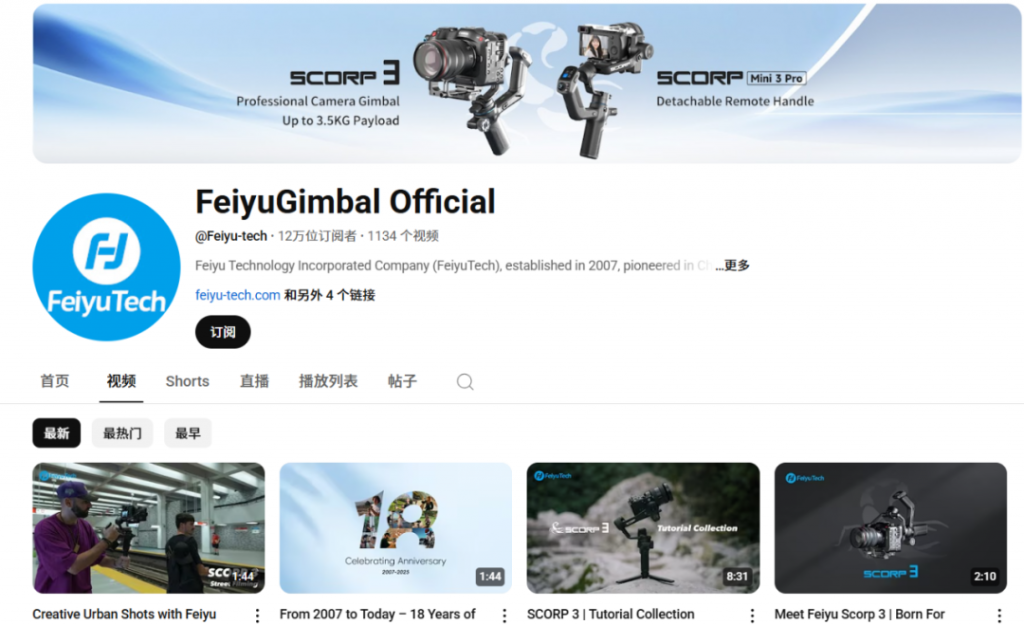 飞宇科技的 YouTube 官方频道已经形成了“评测+教程+作品展示”三类视频内容: