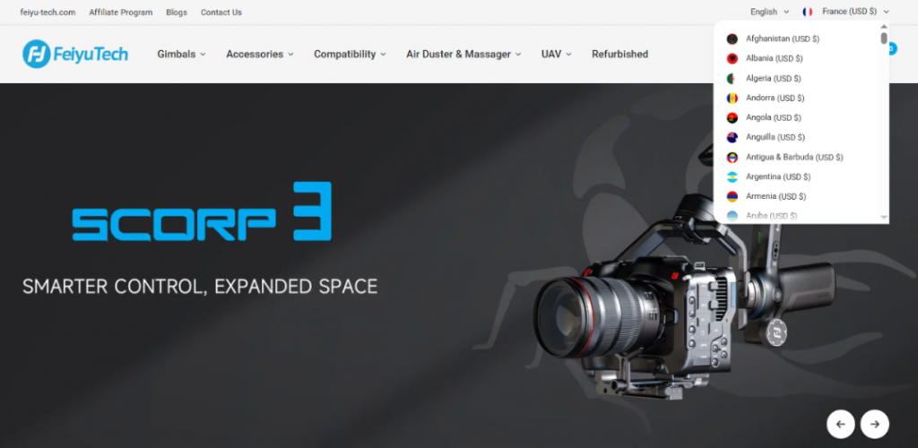 飞宇科技早早搭建了英文独立站(feiyu-tech.com),并针对不同市场开设了地区页面。